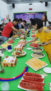 為員工慶祝生日是森榮手袋歷來已久的傳統(tǒng)安排,隨著企業(yè)一年一個(gè)臺(tái)階的上升,這個(gè)大家庭的人數(shù)也在不斷增加,每個(gè)季度的最后一個(gè)工作日,就是本季度所有壽星的生日。當(dāng)天下午五點(diǎn)三十分,在生日快樂歌聲中,八十位壽星陸續(xù)走進(jìn)會(huì)場,長桌上擺滿了為他們準(zhǔn)備的精美食物,甜點(diǎn)水果零食小吃,應(yīng)有盡有,色彩豐富,森榮設(shè)計(jì)師們把專業(yè)特點(diǎn)發(fā)揮到餐桌上時(shí),也絲毫不顯生疏。
