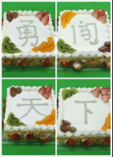 八個(gè)方形生日蛋糕一字排開,寫著今年的標(biāo)語腳踏實(shí)地,勇闖天下。