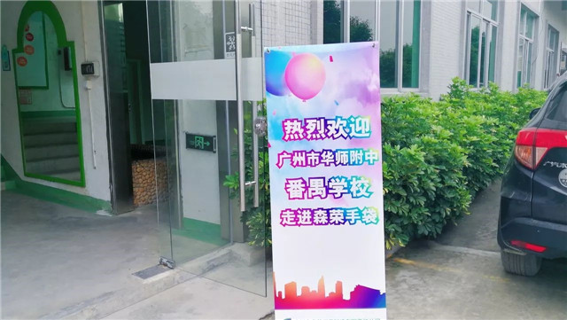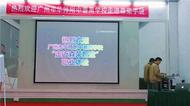 鏡頭轉(zhuǎn)向森榮辦公大樓,一張光彩奪目的海報(bào)赫然映入眼簾:熱烈歡迎廣州市華師附中番禺學(xué)校走進(jìn)森榮手袋。